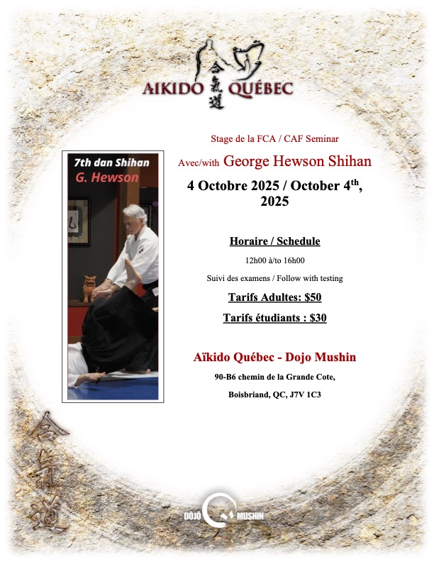 Note: Nous organisons un stage le 4 octobre prochain avec Geoge Hewson Shihan (7e Dan), bienvenu à tous (voir le lien pour plus d'information)
